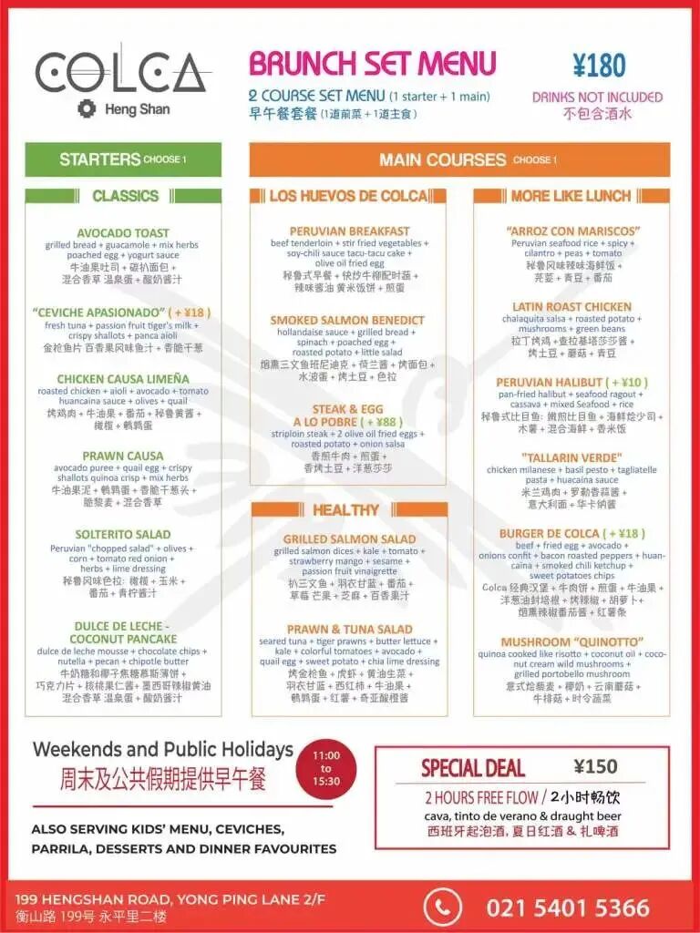 Bhacus, Eduardo Vargas and the Azul Group's latest wine and wood grill venue, has just started up a brunch (did we mention they have a huge wrap-around terrace?) with a whole load of brunch specials, favorites from the dinner menu and a two-hour free flow deal at just RMB250 – check out all the details above.bhacus2/F, 277 Wuxing Road 吴兴路277号,2楼.Colca Heng Shan
