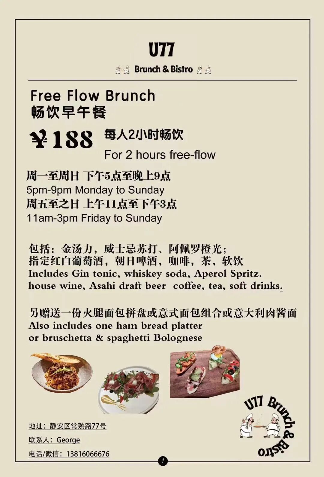 U77 Brunch & Bistro, famed for its pizza oven, juicy steaks and burgers offers a brunch with a Ham and Bread Platter or Bruschetta and Spaghetti Bolognese, washed down with two-hours free flow Gin & Tonic, Whiskey Soda, Aperol Spritz, House Wine, Asahi Draft Beer, Coffee, Tea and Soft Drinks all for just RMB188.Fri, Sat & Sun, 11am-3pm.Saturday Only