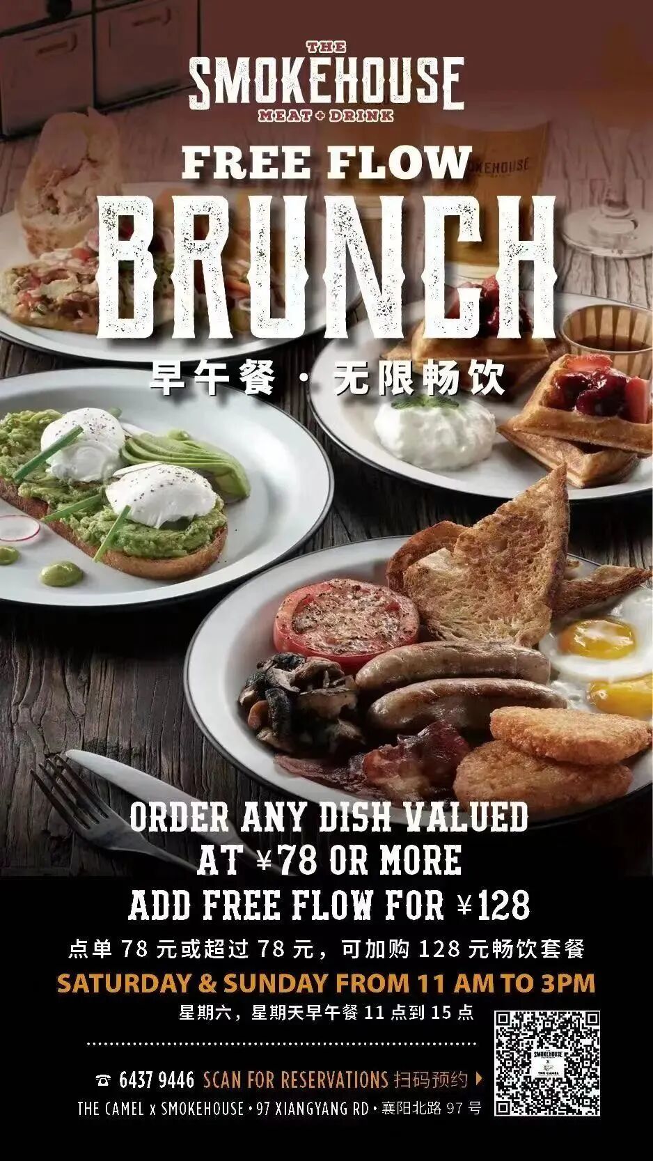 Order any brunch dish at The Smokehouse valued at RMB78 or more and enjoy four hours of free flow for just RMB128.Brunch dishes include Big Brisket Burrito, Biscuits & Gravy, Pulled Pork Tacos, Smoked Fried Chicken & Waffles and more!