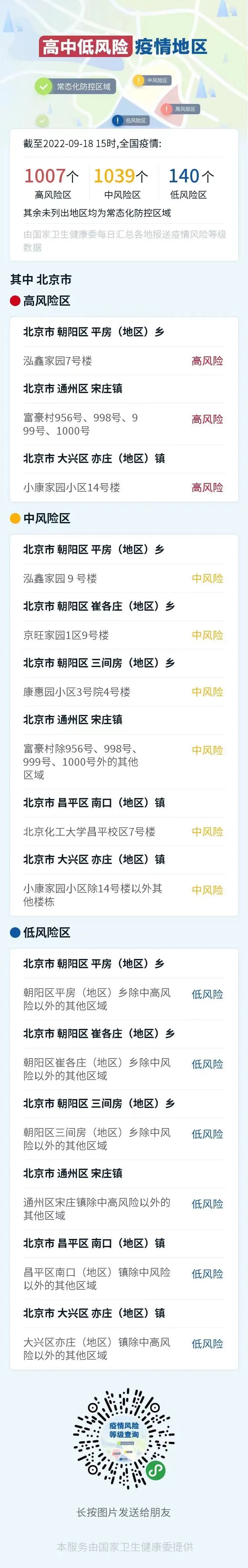 目前,昌平区中高风险区清零。常态化防控期间,仍应做好人员健康监测、消毒通风、定期检测等措施,减少人员聚集、做好个人防护,出现不适及时就诊。