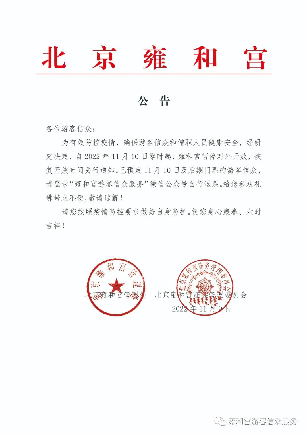雍和宫暂停对外开放