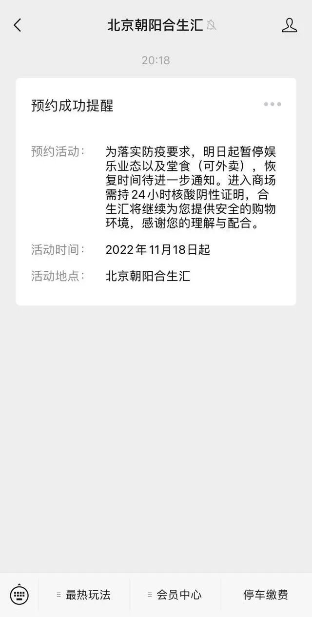 据北京朝阳合生汇微信公众号显示,为落实防疫要求,10月19日起暂停娱乐业态以及堂食(可外卖),恢复时间待进一步通知。进入商场需持24小时核酸阴性证明。
