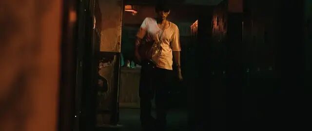 几场追逐戏用了两个我觉得还挺好的设计,一个是杀手的迫近被声音化,腰间的钥匙链晃动被放大了,成为了一种索命声,观众会比角色先听到这个钥匙的声音,那是一种巨大的压迫感,敌在暗,我在明,每响起一声,都像是用刀直接扎观众的耳朵。