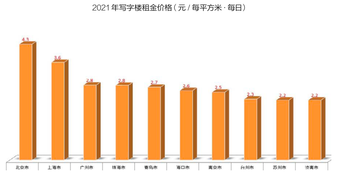 从写字楼租金水平来看,全国有100多个城市租金每天每平方米低于1元。但北京、上海、广州、珠海、青岛海口等15个城市每日每平方米租金高于2元,其中,北京、上海为全国最高,每日每平方米租金在3-5元。