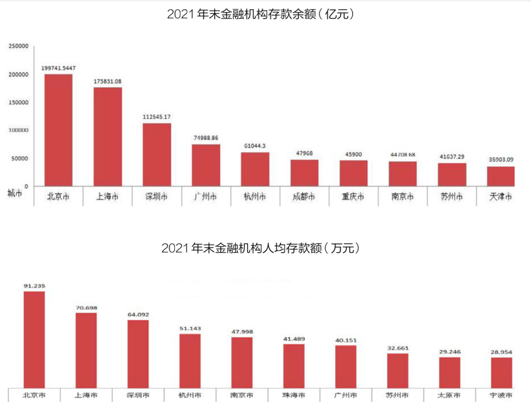2021年末金融机构存款余额及人均存款额(图源:中国城市引力指数报告(2022))