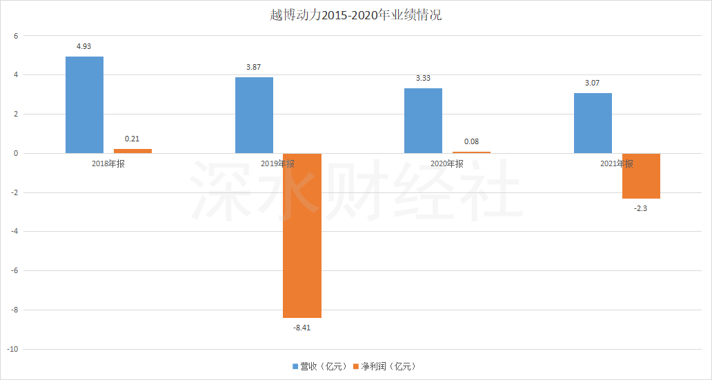 2018年-2021年这四年来,越博动力分别实现营业收入4.93亿元、3.87亿元、3.33亿元、3.07亿元,实现对应净利润为0.21亿元、-8.41亿元、0.08亿元、-2.3亿元。
