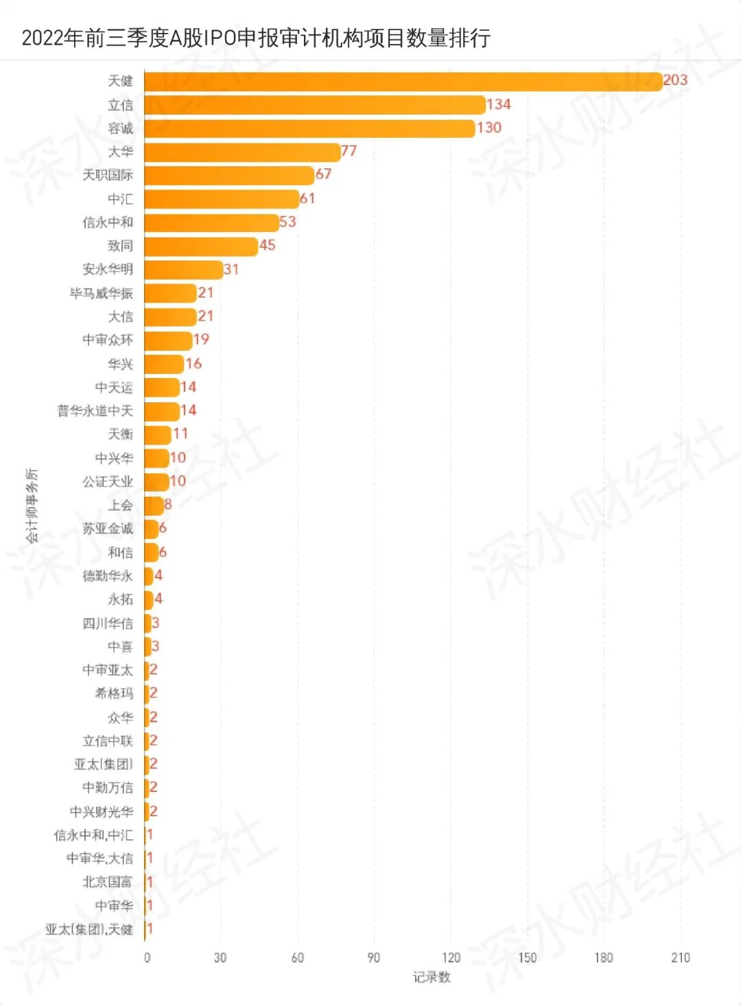 在审计服务方面,天健会计师事务所有203家项目在排队当中,位居审计机构首位,并且远远领先其他同行。
