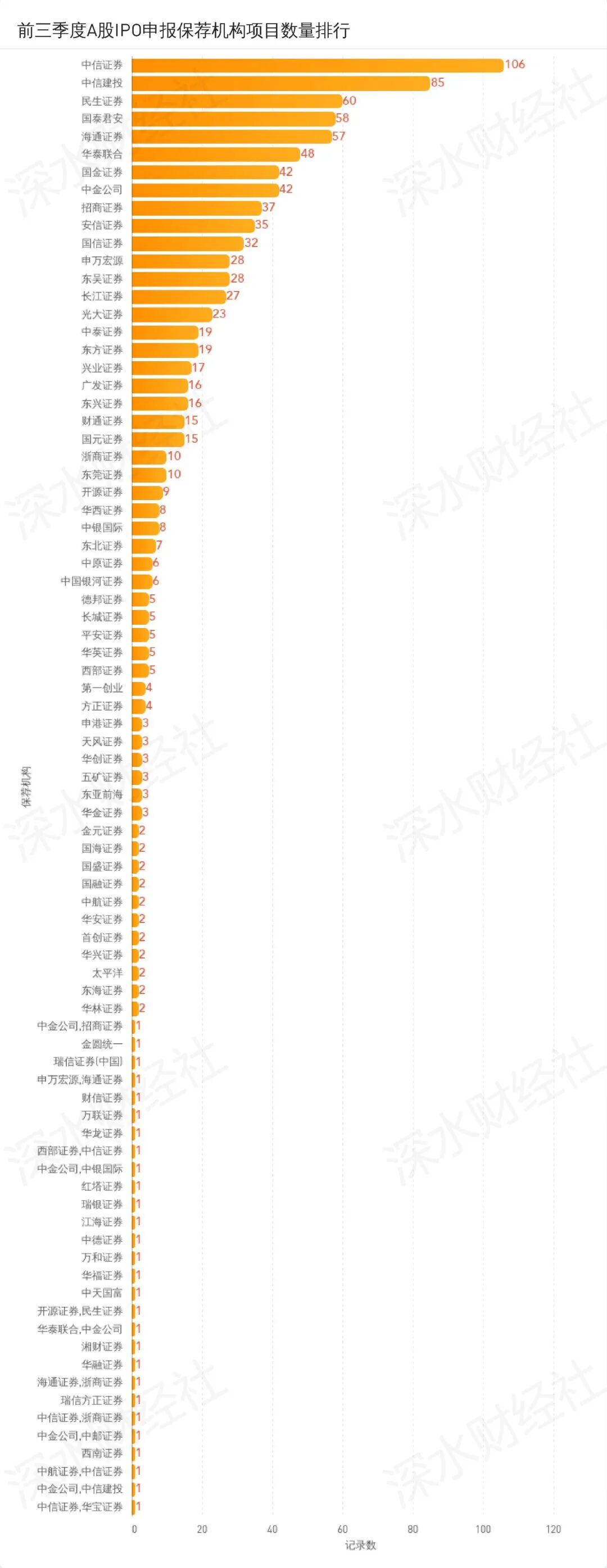 国内IPO市场一哥非中信证券莫属,截至9月30日,中信证券有106家保荐项目在排队,高居第一。同门兄弟中信建投也当仁不让以85家位居第二位。民生证券以60家排在第三。