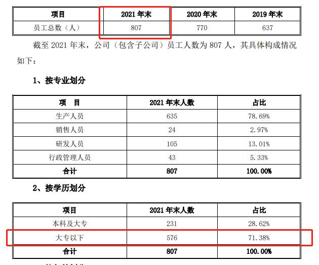 不仅如此,科创板还要求研发人员占当年员工总数的比例≥10%,安芯电子的这项数据为13.01%,虽然及格了,但截至2021年年末,该公司员工为807人,其中7成以上为大专学历,而本科及大专占比为28.62%,甚至并无硕士及以上的学历员工,这对于一家要冲击“科创板”的半导体公司来说,未免有些太不可思议。