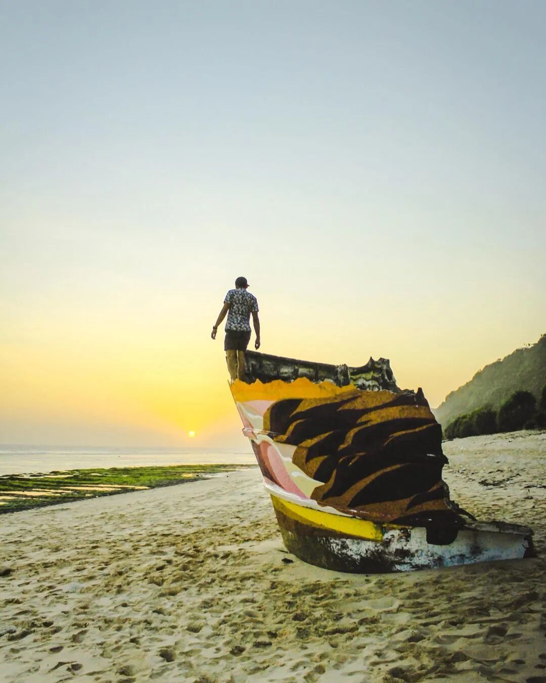 巴厘岛的每个海滩都有不同的美,位于巴东县(Badung)的农加兰海滩(Nunggalan Beach),以其湛蓝海水、珠光沙、残破的船只,构成了完美的旅行画面。