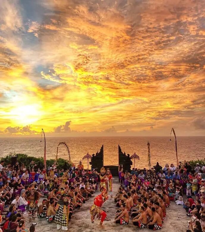 乌鲁瓦图(Uluwatu)位于巴厘岛的最南端,当金黄的落日行将西坠之时,您就能在悬崖剧场上迎着海上日落观看震撼人心的卡恰舞(Kecak dance),这是一场以美丽日落为背景,神秘又壮丽的表演。
