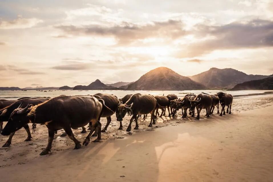 成排的水牛踏着夕阳回家了,这宛如中国江南的风景,却出现在印尼龙目岛的海滩——斯隆贝拉纳克海滩(Selong Belanak Beach)经过一天的觅食,水牛们踏浪而归的身影,如今也成为无数游客顿点守候的景观了。