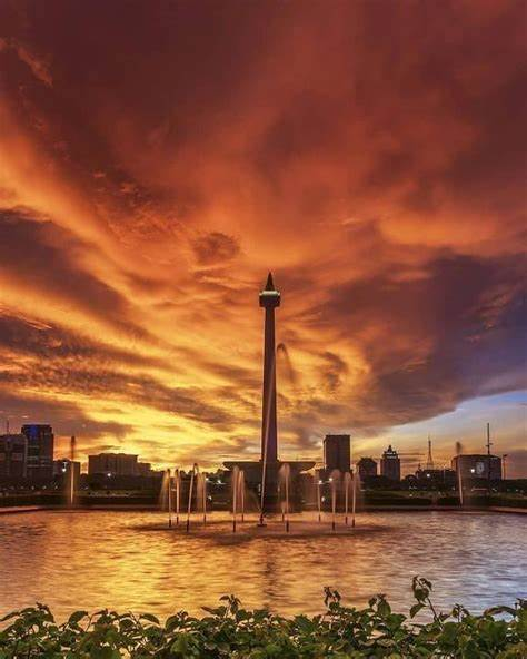 印尼首都雅加达(Jakarta)中部,矗立着高达132米的印尼国家纪念碑(Monas),为纪念印尼人民争取独立于荷兰殖民统治而建。纪念碑顶部镶有火焰雕塑,覆盖金箔,象征着印度尼西亚人民热烈的奋斗精神,在金色的夕阳里格外熠熠生辉。