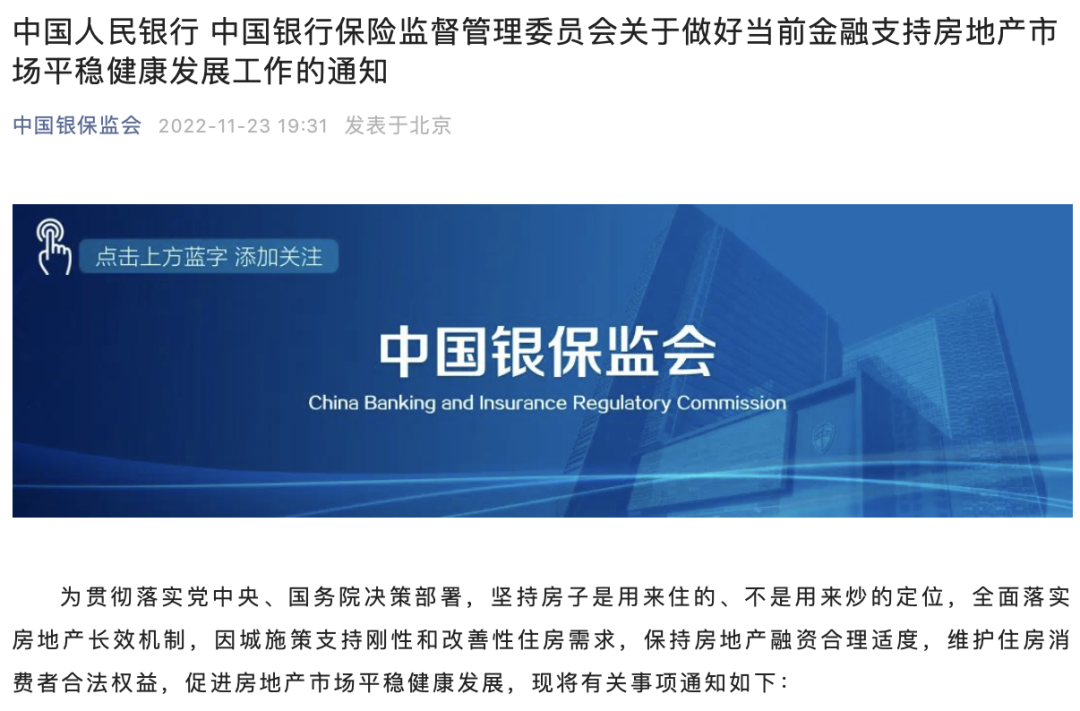 中国人民银行、中国银行保险监督管理委员会在11月23日发布关于做好当前金融支持房地产市场平稳健康发展工作的通知,全面落实房地产长效机制,因城施策支持刚性和改善性住房需求,保持房地产融资合理适度,维护住房消费者合法权益,促进房地产市场平稳健康发展。