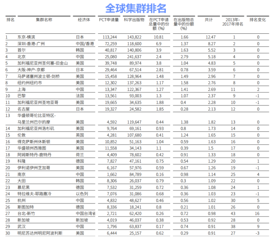 世界知识产权组织发布的《2020年全球创新指数(GII)报告》显示,在全球131个经济体中,中国今年保持在全球创新指数榜单第14名。值得注意的是,中国有17个科技创新集群进入全球科技集群百强,数量仅次于美国。其中,深圳-香港-广州名列第2、北京第4、上海第9,南京、苏州分别位列第21和第72。