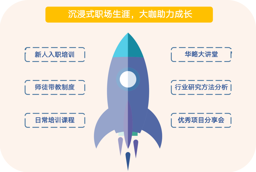 华略现有职级由低到高排序为:研究员、高级研究员、研究经理、高级研究经理、副总监、总监。应届生入职一般从研究员岗位开始,社会招聘人士则根据以往工作经验和专业技能对应相应职级和岗位。