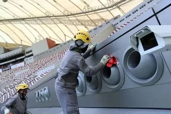 场馆不仅在设计上最大程度降温外,馆内空调系统也同样开足马力工作。8座世界杯球场中,有7座球场都安装了这种降温系统。足球场地四周以及观众席下部都安装有通风口,比赛期间,冷风会源源不断地从通风口送出。