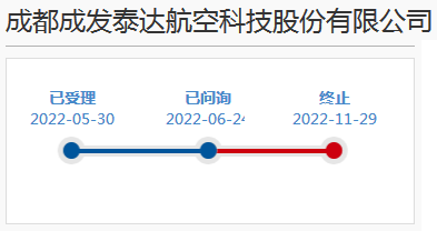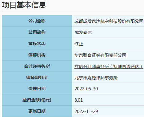 2022年11月25日,成都成发泰达航空科技股份有限公司因发行人撤回发行上市申请或者保荐人撤销保荐,上交所终止其发行上市审核。![]()