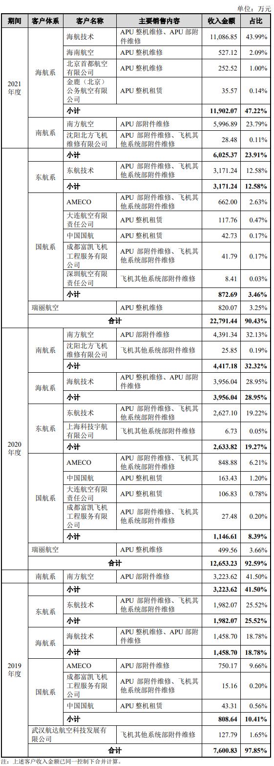 成都成发泰达航空科技股份有限公司(“成发泰达”)人是一家专业从事民航飞机辅助动力装置(Auxiliary Power Unit,以下称 APU)整机、部附件以及民航飞机其他系统部附件维修的高新技术企业,同时,为充分服务客户需求,公司还适时开展 APU 整机租赁业务。民航维修是一种将偏离可用状态的航空器或者航空零部件恢复到适航状态的过程,发行人在开展 APU 维修业务的过程中,主要是通过焊接、精密加工、气相沉积、热喷涂、精密锻造、精密铸造等制造、增材制造工艺技术,将发动机燃烧室、涡轮盘、叶片等存在材料丢失、断裂、涂层脱落、冷却孔堵塞等缺陷的航空零部件恢复性能,以满足航空管理单位的适航性要求。公司主要从事民航飞机 APU 整机、部附件以及民航飞机其他系统部附件的维修业务,下游民航运输业市场集中度较高,公司报告期内的主要客户为四大航空公司。报告期内,公司对前五大客户的销售金额分别为 7,600.83 万元、12,653.23 万元及 22,791.44 万元,占营业收入的比例分别为 97.85%、92.59%及90.43%,占比较高。报告期内,发行人向前五大客户的销售情况如下: