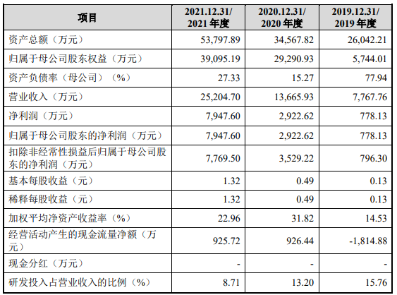 报告期各期,公司营业收入分别为 7,767.76 万元、13,665.93 万元和25,204.70 万元,净利润分别为 778.13 万元、2,922.62 万元和 7,947.60 万元,扣除非经常性损益后归属于母公司所有者的净利润分别为796.30万元、3,529.22万元和 7,769.50 万元。应收账款:报告期各期末,公司的应收账款账面余额分别为 3,542.31 万元、7,910.38 万元及 17,049.43 万元,占资产总额的比例分别为 13.60%、22.88%及 31.69%。其中,公司对海航技术的应收账款余额分别为 2,020.47 万元、4,680.33 万元及12,083.16 万元,占应收账款余额的比例分别为 57.04%、59.17%及 70.87%,是发行人应收账款第一大客户。2021 年 2 月,海南航空及其子公司进行破产重整,海航技术作为海南航空下属子公司,亦在破产重整的范围内。截至 2021 年 12 月 31 日,发行人对海航技术的应收款项中,有 2,998.64 万元为破产债权。2022 年 1 月,海航技术已将该部分款项全额支付,至此,破产重整过程中确定的破产债权 5,302.12 万元已全部支付完毕。由于公司应收账款金额较大且集中度较高,第一大客户海南航空破产重整案实施完毕后,管理、业务等方面仍需继续调整。如果个别主要客户的生产经营状况发生不利变化,或海南航空管理、业务等方面调整使其生产经营发生不利变化,相关应收账款无法按期收回,公司的资金周转速度和经营活动的现金流量将受到不利的影响。![]()