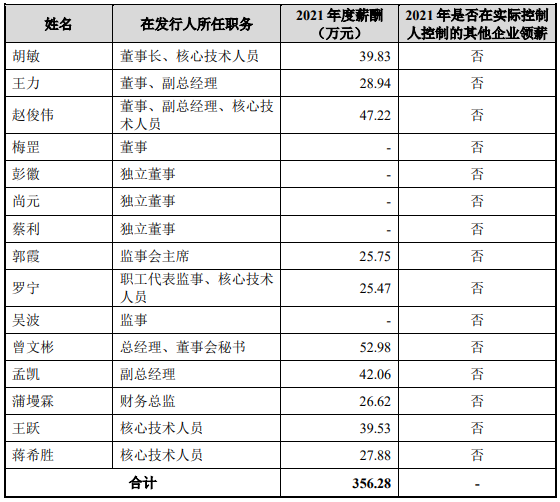 公司的控股股东、实际控制人为胡敏先生。截至本招股说明书签署日,胡敏先生直接持有公司 1,708.17 万股股份,通过合力泰达控制公司 496.82 万股股份。胡敏先生合计控制本公司 2,204.99 万股股份,占本次发行前总股本的36.75%。胡敏先生,男,1976 年生,中国国籍,无永久境外居留权,中专学历,胡敏先生 1997 年毕业于成都航空工业学校应用电子工程专业;1997 年 9 月-2001 年6 月,任西南航空飞机维修公司工程师;2001 年 7 月-2003 年 5 月,任西安翔宇航空科技股份有限公司研发部经理;2003 年 9 月-2008 年 12 月,任四川翔宇航空科技有限公司副总经理;2009 年 1 月-2013 年 12 月,任汉中一零一航空电子设备有限公司设计所型号总师;2014 年 1 月-2020 年 9 月,任成都航利航空机电装备制造有限公司总经理;2016年3月-2021年10月,任成发泰达有限董事长、总经理;2021 年 10 月至今,任公司董事长。曾文彬先生,1975 年 12 月出生,中国国籍,无境外永久居留权,硕士学位。曾文彬先生 2000 年本科毕业于西北工业大学飞行器动力工程专业,2017年硕士毕业于中国民航大学工商管理专业;2000 年 7 月-2011 年 4 月,先后任海南航空股份有限公司维修工程部技术员、工程师、主管、飞机维修经理;2011年 4 月-2021 年 5 月,先后任海航技术生产计划部副经理,海航技术华北维修基地副总监、总监,海航技术战略发展部董办专员,海航技术企业发展部副经理、经理;2018 年 4 月-2021 年 11 月,任天津天宇航空发动机维修有限公司经理;2021 年 4 月-2022 年 4 月,任海口美兰空港吉耐斯航空发动机维修工程有限公司董事;2021 年 6 月-2021 年 10 月,任成发泰达有限总经理助理;2021 年 10 月至今,任公司总经理、董事会秘书。蒲墁霖女士,1996 年 3 月出生,中国国籍,无境外永久居留权,本科学历。蒲墁霖女士 2018 年本科毕业于绵阳师范学院信息管理与信息系统专业。2018 年 7 月-2020 年 4 月,任四川岷江电化有限公司财务部经理;2020 年 4 月2021 年 10 月,历任成发泰达有限董事、财务总监;2021 年 10 月至今,任公司财务总监。董事、监事、高级管理人员及核心技术人员最近一年从发行人领取收入的情况情况如下:![]()