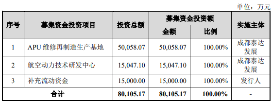 海航系客户销售占比较高:报告期内,公司对海航系客户的销售金额分别为 1,458.70 万元、3,956.04 万元及 11,902.07 万元,占营业收入的比例分别为 18.78%、28.95%及 47.22%,收入占比逐年提高。其中,2021 年海航系客户对公司 APU 整机维修需求快速提升,公司实现收入 10,961.27 万元,直接带动了公司 2021 年销售金额的快速增长。2021 年 2 月 10 日,海南省高级人民法院依法分别裁定受理海南航空及其十家并表子公司(包括海航技术)重整案;2021 年 12 月 31 日,海南航空及其子公司收到海南高院送达的《民事裁定书》,确认《重整计划》已执行完毕。截至本招股说明书签署日,海南航空及其子公司已完成了破产重整,与发行人的业务开展正常。本次公开发行股票不超过 2,000.00 万股,占发行后总股本的比例不低于 25%,拟融资8.01亿元,主要用于投资如下项目:![]()