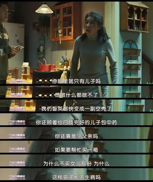 金智英的妈妈年轻的时候,为了补贴家用,主动辍学打工,结婚后接连生下两个女儿后,才生出一个儿子。