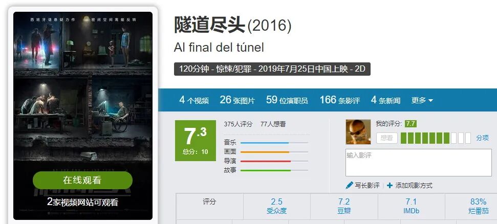 喜欢悬疑惊悚题材的观众不要错过《隧道尽头》。大家观影前也不要看剧透式影评,那将会大大降低观影感受。