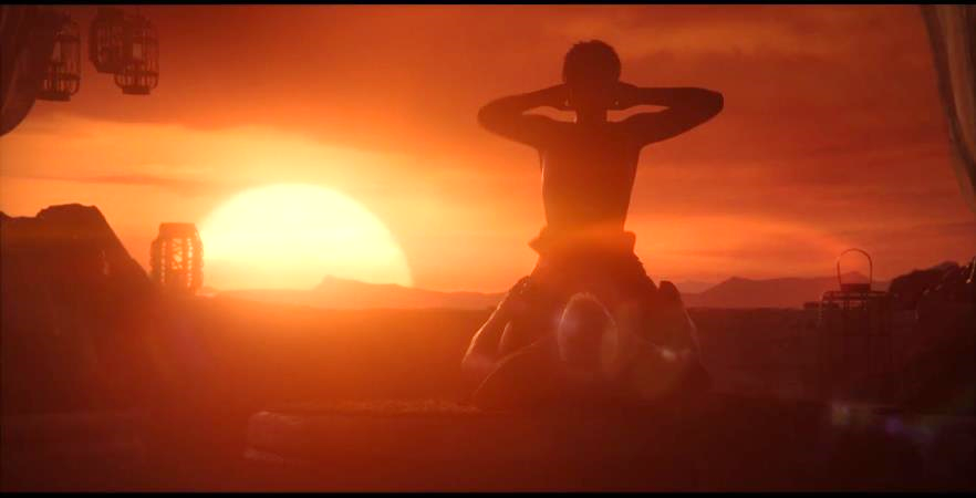 整部短片看起来更加具有赛博朋克和未来感。贵族在高耸入云的建筑内优哉游哉聚会又让人联想到《第五元素》。
