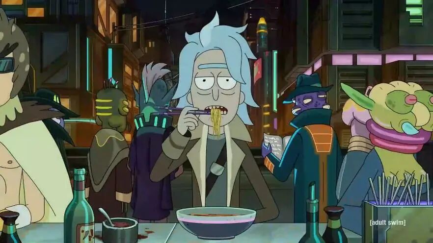 瑞克在屠杀间隙吃面条,致敬的是《银翼杀手》(Blade Runner ,1982)里克·德卡德在路边摊吃面条。