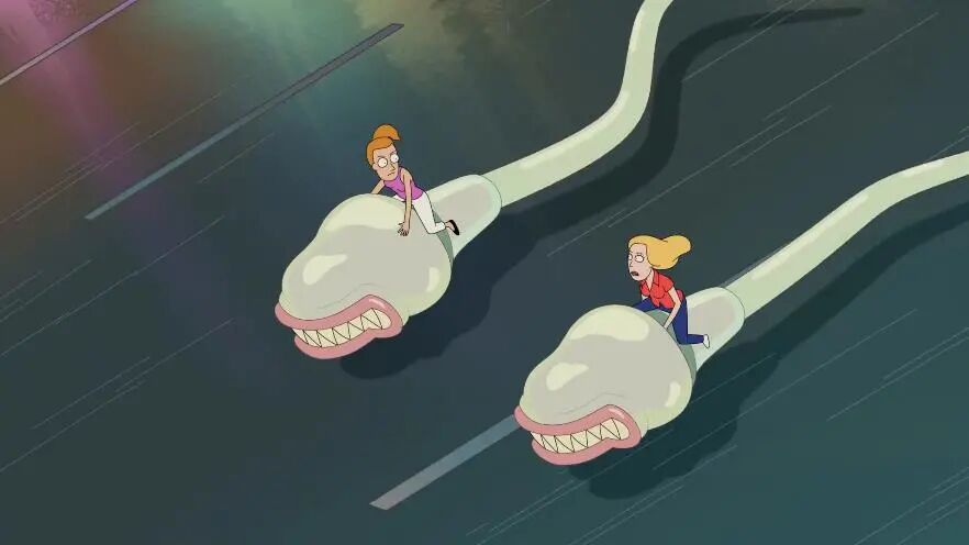 瑞克直接提到了汉·索洛(Han Solo)。他勒死了精子女王的一幕,就像莱娅对赫特人贾巴一样。贝斯、夏末骑着精子飞车的镜头也是如此。