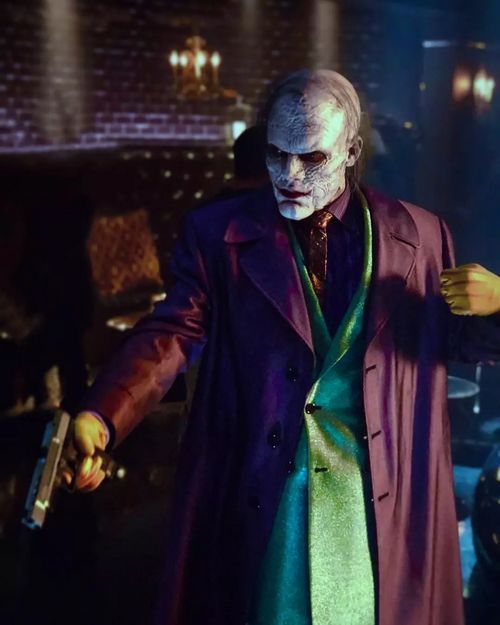 剧中杰罗麦重现《致命玩笑》中小丑诞生经典一幕,坠入ACE化工厂的原液中,最终成为面目可憎的小丑。