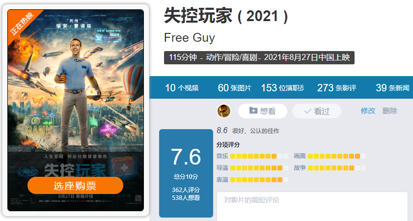 由于当地疫情防控需要,影院迟迟没有开门,前天影院用于开放,我第一时间去看了《失控玩家》。