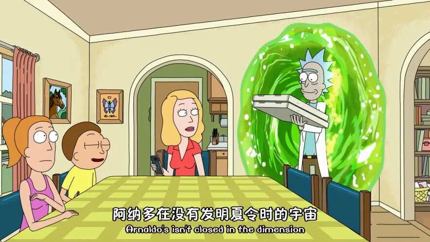 瑞克利用传送枪进入另一个不适用夏令时的宇宙,拿回了披萨。