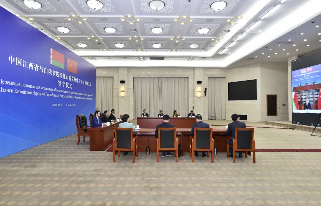 10月31日,江西省与白俄罗斯维捷布斯克州通过视频连线方式,签署建立友好省州关系协议书。省长叶建春、维捷布斯克州执行委员会主席苏博京出席签字仪式并致辞。副省长陈小平、维捷布斯克州执行委员会副主席杜勒诺夫出席。中国驻白俄罗斯大使谢小用、白俄罗斯驻华大使尤里·先科在线见证。
