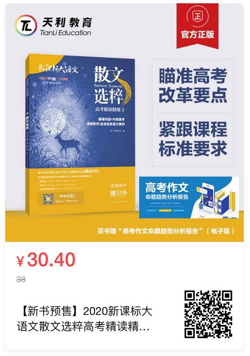 《散文选粹 高考精读精练1》新书火热预售中!!书中甄选名家、大家以及一些优秀作家的作品,题材广泛,思想性强,瞄准高考改革要点,紧跟课程标准要求,提升学生鉴赏能力、审美素养与写作素养。