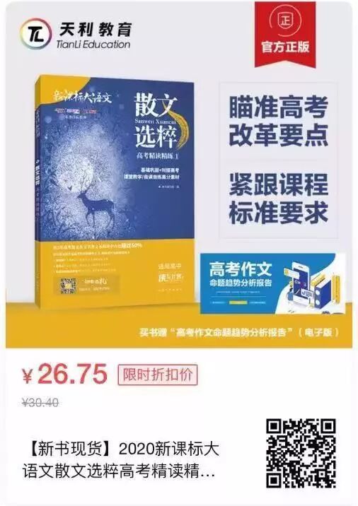 《散文选粹 高考精读精练(1)》新书热卖中!书中甄选名家、大家以及一些优秀作家的作品,题材广泛,思想性强,瞄准高考改革要点,紧跟课程标准要求,提升学生鉴赏能力、审美素养与写作素养。