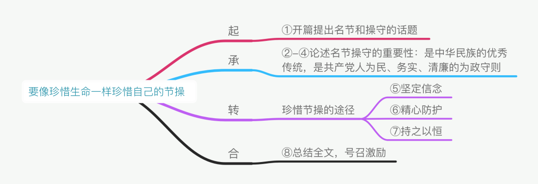 ⑧“名节重于泰山”。在全面建设社会主义现代化国家的新征程中,把节操作为最执着的坚守,争做一尘不染的人,党员干部就能让生命在践行“忠诚、干净、担当”中绽放绚丽的光彩。(总结全文,号召激励。)