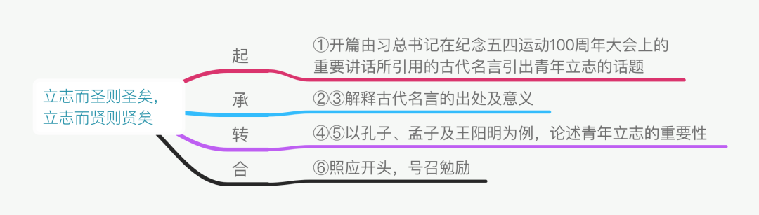 ①新时代领路人在纪念五四运动100周年大会上发表重要讲话,指出:“青年的理想信念关乎国家未来。青年理想远大、信念坚定,是一个国家、一个民族无坚不摧的前进动力。青年志存高远,就能激发奋进潜力,青春岁月就不会像无舵之舟漂泊不定。正所谓‘立志而圣则圣矣,立志而贤则贤矣’。” (开篇点题。由新时代领路人在纪念五四运动100周年大会上的重要讲话引用古代名言引出青年立志的话题。)