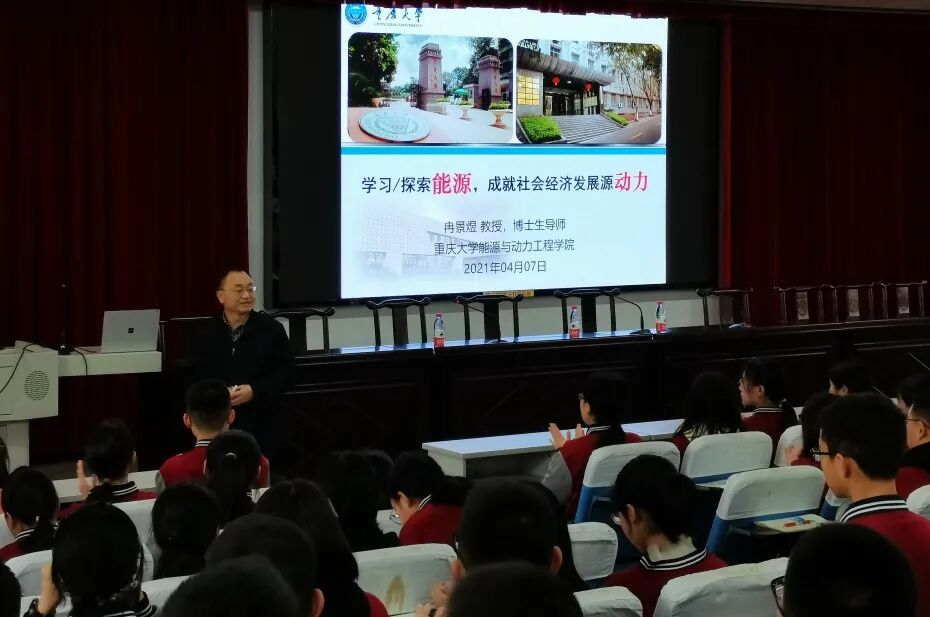 冉景煜教授分别在三所中学开展了以《学习/探索能源,成就社会经济发展源动力》为题的学科讲座。他从能源的内涵、能源对人类社会发展的重要性、能源动力类专业的内涵以及重庆大学能源动力类专业的优势特色等方面,带大家认识了能源动力类专业的魅力和前景。