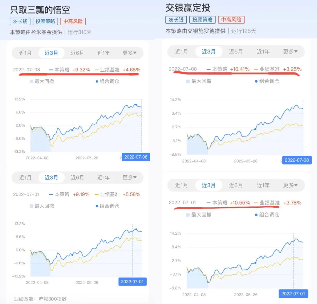 我定投的这个策略本期微涨0.14%,本期跑赢了明星组合【赢定投】(-0.14%)。由于明星组合只运行3个多月,所以截取的区间也是3个月的,3个月内的走势几乎差不多。