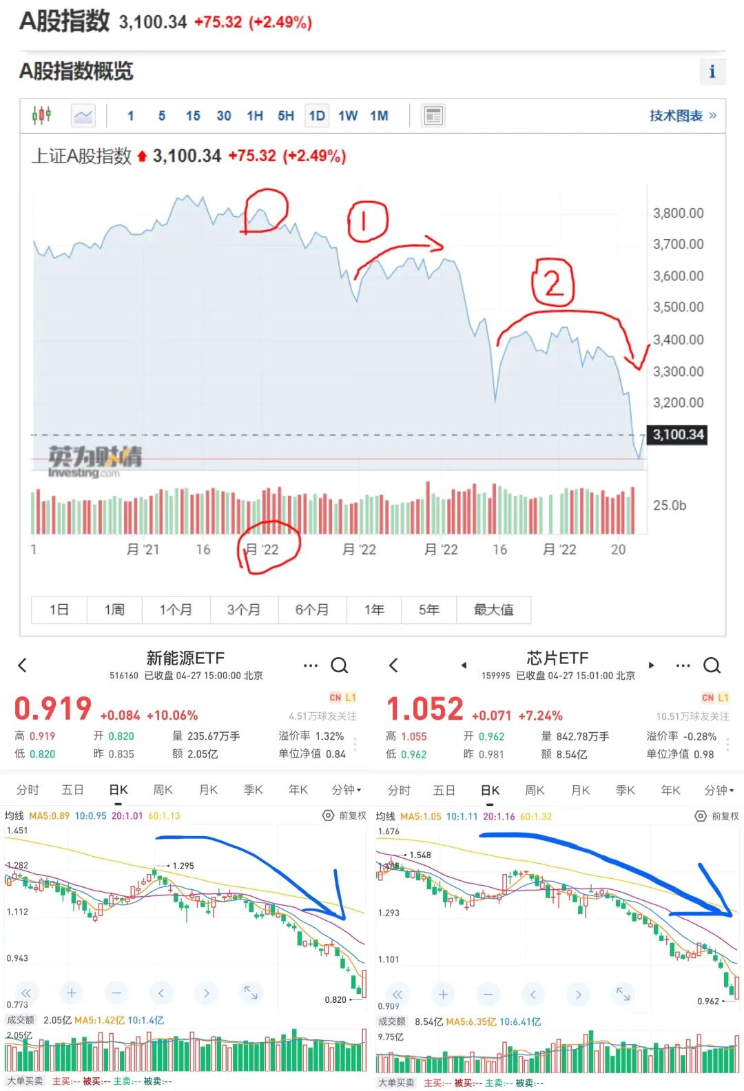 今日主要是新能源(包含新能源汽车、风光电板块)和芯片板块很强,反弹凶猛,其中新能源ETF甚至收盘涨停了。