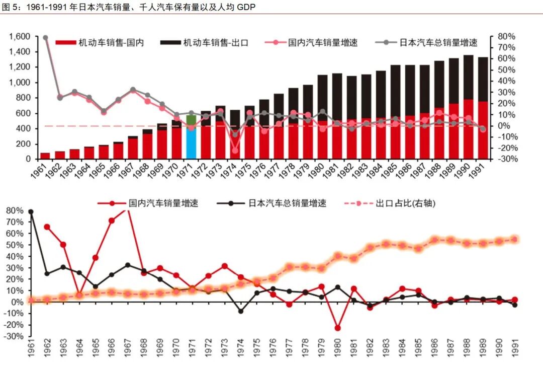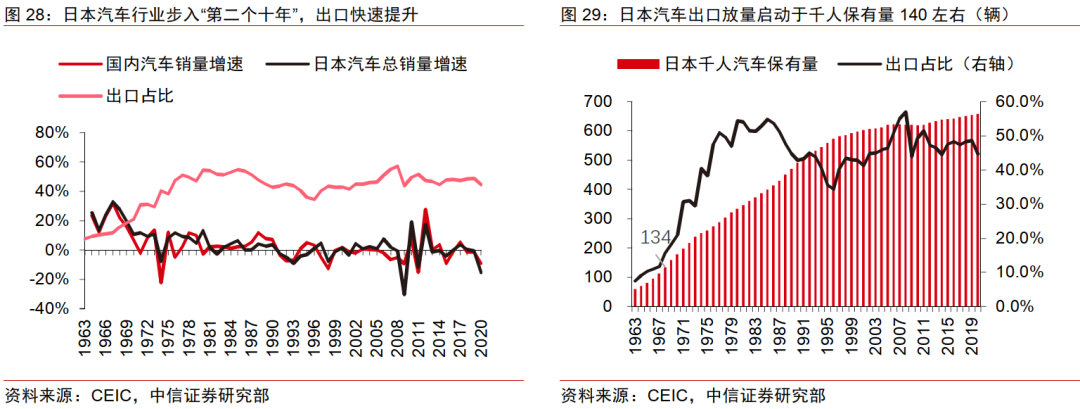 我国有机会复制日本汽车的成功经验,日本汽车的成功离不开一手低油耗的牌。如下图所示(PS:数据来自中信证券),第一次石油危机(1973年)发生后,以节油性著称的日系车的需求出现了井喷式的增长。