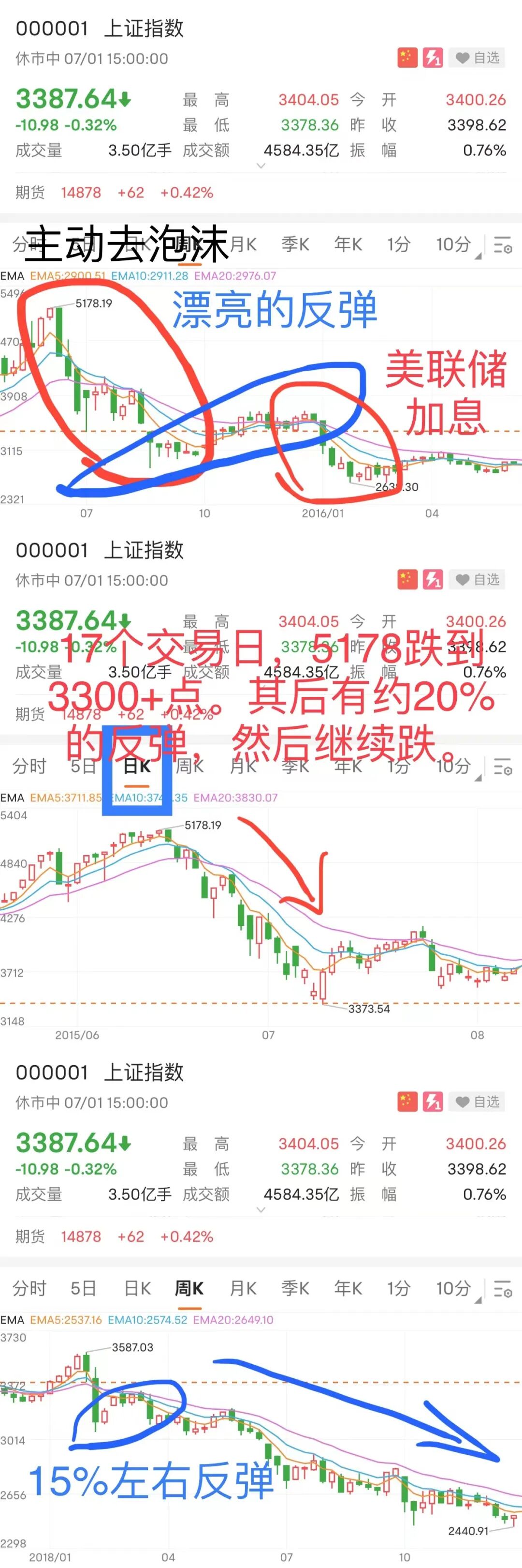 15年股灾,官方定义【此波股市猛升猛降,为一场金融犯罪行为】,并成立专案组调查,徐翔就是这次因为操纵股市被抓的。15年A股第一轮下跌可以说是“主动去泡沫”,主要是遏制投机炒作,遏制金融泡沫。这轮跌到道2850点才结束,期间也有两个小反弹。