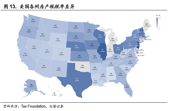 美国:美国房产税占税收收入比重约12%,税率方面,税率形式采用的差别化比例税率,各州的税率虽然差异大,但总体大致维持在0.2%至3%之间,平均税率为1.5%。