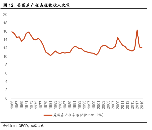 英国:英国的房产税发展较为完善,分为居住房屋税和营业房产税。居住房屋税针对居住用房屋,偏重追求稳定和公平。课税对象为居住用房,按照从价计征的方式依据房屋评估价值征收。英格兰和苏格兰等地区政府按价值梯度分为A-H各等级,威尔士地区则分为A-I各等级。英国房产税占税收收入比重也约12%。
