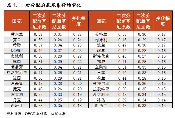 二次分配对于控制贫富差距具有重要意义,下图是红塔证券整理的他国历史经验,数据显示二次分配可以有效降低基尼系数控制贫富差距。