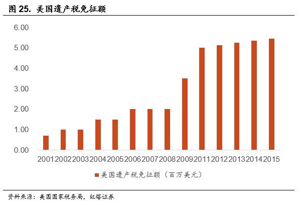 美国:美国的遗产税税率实行16级超额累进税率,遗产税和赠与税统一适用,边际税率从18%至50%不等,也就是说遗产越大,需要承担的税率就越高。不过随着经济社会发展,美国遗产税的起征点也在不断提高。历史数据显示,美国遗产税收入在税收总额占比基本维持在1%到2%的水平(参照我国17万亿税收,遗产税潜在收入是每年3000亿左右)。