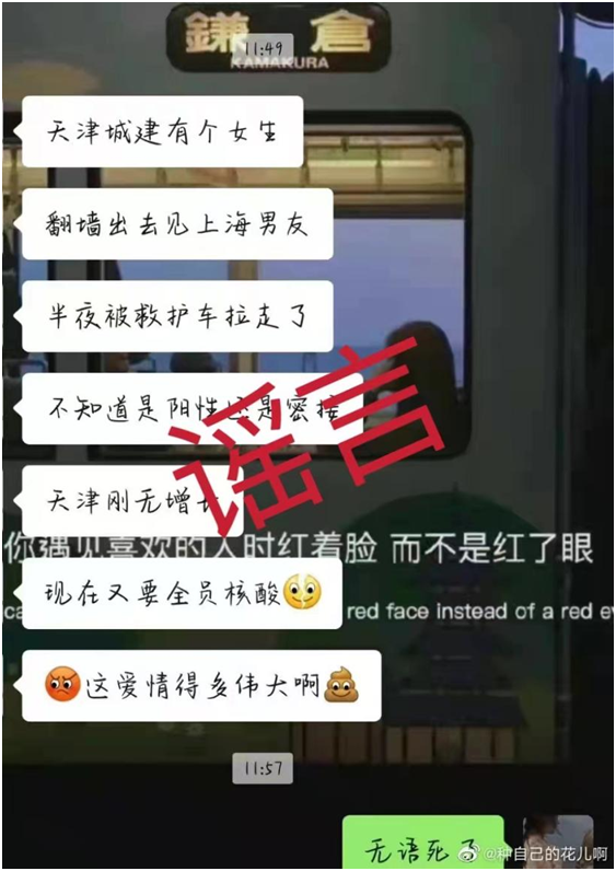 接网民举报,有人在圈群传播“天津城建大学有女生翻墙”“两位男士为‘天津城建大学确诊病例’”等信息。经与有关部门核实,均为不实信息,不存在所谓的“翻墙女生”,网传视频中人员并非我市学生。