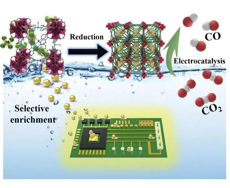 基于前期研究成果,近日赵斌教授团队构建了一例具有[Zr48Ni6]纳米笼结构的簇基MOF材料,其展现出较大的比表面积(1569 m2 g-1)、孔道尺寸(0.8 nm)以及良好的溶剂/pH稳定性。此簇基MOF可从含有Fe、Ni、Cu、Co、Zn和Mn等干扰离子的模拟电子垃圾废液中选择性回收AuCl4-,并采用热还原方法使其转变为Au NPs@MOF催化剂,且可通过改变AuCl4-吸附量实现负载金纳米颗粒的尺寸在2.36~4.36 nm范围内进行调节。研究表明Au NPs@MOF可高效电催化CO2还原为CO,优化电催化反应条件后CO的最高法拉第效率可达95.2%,电流密度高达102.9 mA cm-2,并且可以在15 h内维持催化性能的稳定。Au NPs@MOF催化剂高效稳定的电催化性能源于MOF中[Zr48Ni6]纳米笼的限域效应可有效避免金纳米颗粒的团聚。此外,成本计算表明,此Au NPs@MOF催化剂成本仅为2.286 $ g-1,远低于5 nm尺寸金基催化剂的价格(1341 $ mL-1)。本工作首次提出通过多孔簇基MOFs从模拟电子废弃物中富集金属源制备金基催化剂的策略,为制备低成本、高性能的金基催化剂提供了一条可行的方案。